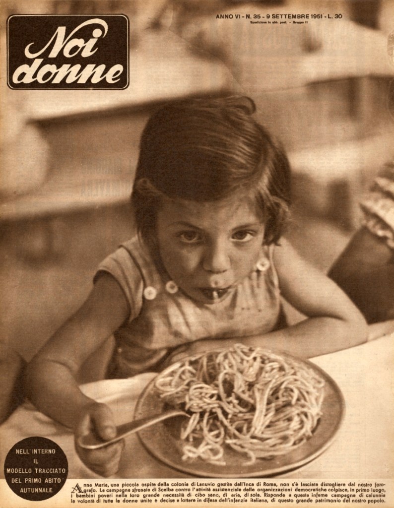 A Ferrara Vania, spulciando tra le carte dell’archivio storico Udi, consulta la loro intera collezione della rivista “Noi donne”, sperando di trovare – nei numeri dei primi anni di dopoguerra – qualche articolo sulla nostra storia. Rimase colpita da una copertina in particolare: Era una bimba che mangiava degli spaghetti, che guardava in macchina quasi a dire: perché mi disturbate? Pensai fosse bellissima e ne feci la scansione.