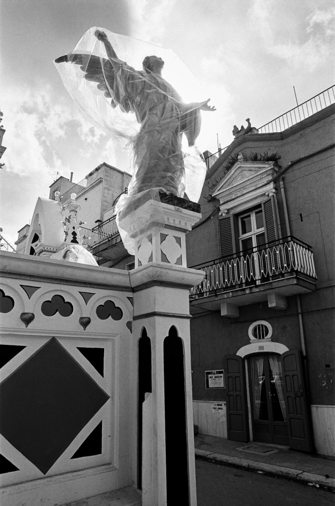 Dalla brochure di presentazione: «Ho scelto le sole fotografie in bianconero. Il corpus di base è costituito da migliaia di scatti che documentano ogni singola occasione festiva con sequenze di tipo analitico e prese da diverse prospettive spaziali e cronologiche. La scelta oggi è stata quella di cogliere le immagini ‘a campione’, tralasciando il ‘racconto’ di ogni singola occasione. Una scelta fatta con lo sguardo del presente e con la memoria visiva personale, privilegiando i momenti costitutivi e simbolici delle feste e dei rituali, con un’attenzione particolare alla dimensione estetica e rappresentativa, piuttosto che didascalica e documentaria. Un percorso che si snoda e distende sul territorio pugliese partendo dal Gargano, attraverso il Tavoliere, il Subappennino Dauno, la Terra di Bari, fino a raggiungere Brindisi e Ostuni».