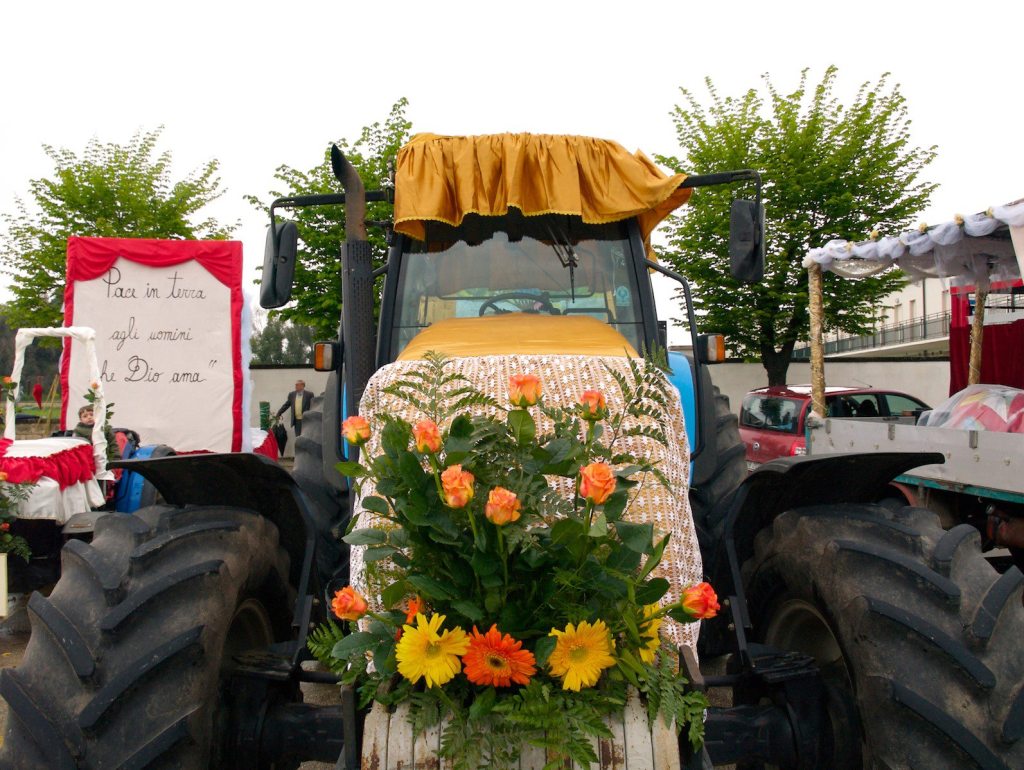La monumentale mietitrebbia si accoda al minuscolo treruote, i raffinati manufatti di spighe di grano si circondano di decadenti fiori di plastica, gli ori trionfano insieme alle chincaglierie, i rasi e le sete soffocano tra gli stracci. Così come in un gracchiare di altoparlanti, un ronzio di microfoni e un’eco di dischi consunti, si perdono le intonazioni straziate dei canti ispirati alla antica leggenda, gridati come una interminabile supplica e un doveroso omaggio finché durano il fiato e le forze. Così come le trepidanti invocazioni di grazia e di protezione – dagli incidenti, dalle malattie, dalle avversità incombenti sull’esistenza, dalle calamità naturali che minacciano la terra e il raccolto – si diluiscono in un tripudio festivo di esibizioni, di offerte, compensazioni e competizioni.