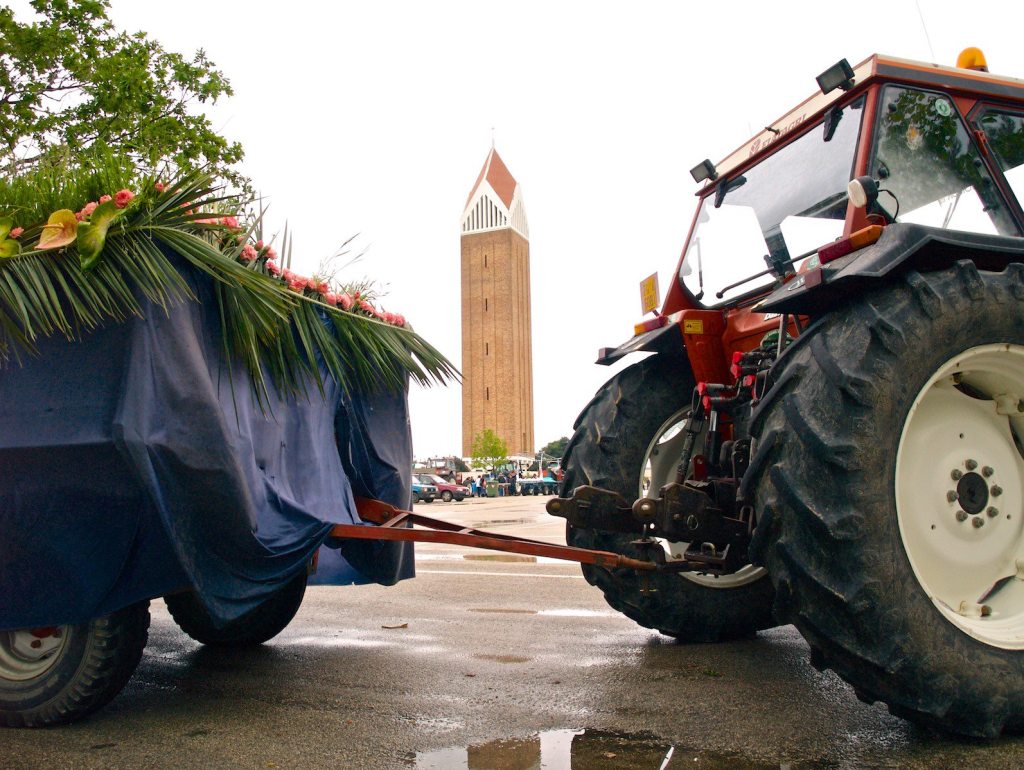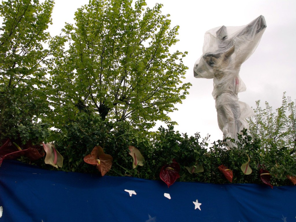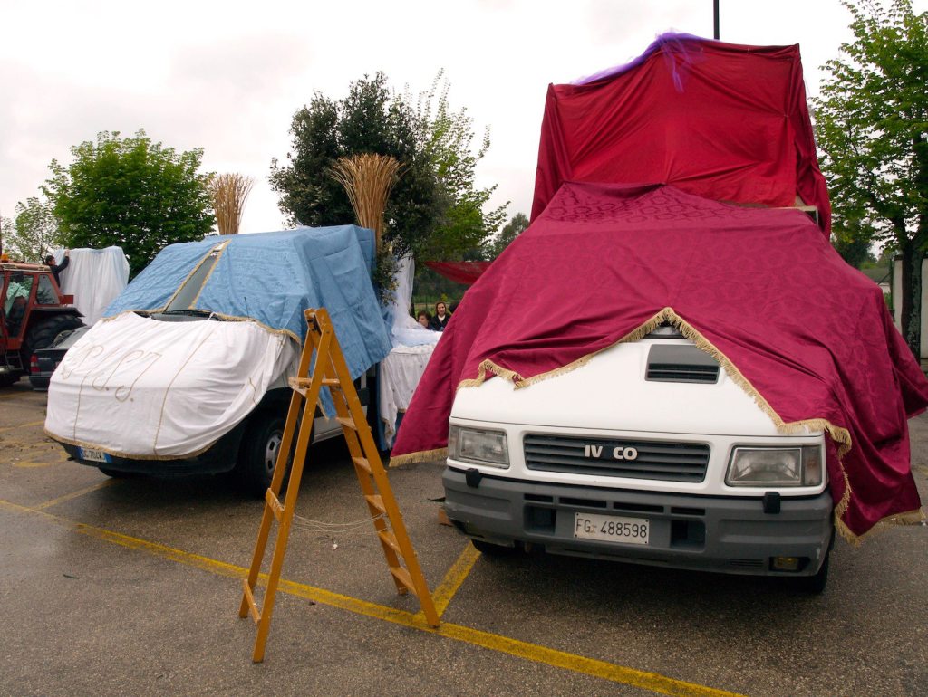 Quella che si offre all’occasionale spettatore è la rappresentazione aggrovigliata e caleidoscopica di un’unica, identica scena moltiplicata nei riverberi di innumerevoli specchi, dove si mescolano e si confondono cromatismi esasperati e soffusi, oggetti comuni e preziosi ornamenti, puntiglioso realismo e fantasiosa metafora. La Cavalcata è uno spettacolo la cui trama come nella tradizione del teatro orientale – è nota e codificata ma la cui capacità di ammaliare e sorprendere torna ciclicamente ad affidarsi a sottili reinvenzioni e ad abili sostituzioni, tali da rigenerare la curiosità e l’attesa per un rinnovato piacere dello sguardo. La scena: l’albero, la lampada votiva, la madonna, il pastore, il cacciatore, San Michele e il diavolo, gli angeli. Trattori e carri, quotidiani strumenti di lavoro condotti a ricevere il battesimo e la benedizione divina, diventano gli spazi rituali della rappresentazione. Avvolti da semplicissimi tessuti – coperte da letto, tende, tovaglie; rivestiti di velluti pesanti, nylon fruscianti, tulli voluminosi; ricoperti con arcate di frasche, tappeti di fiori, pareti di festoni, si trasformano in dimore paradisiache e celesti o nei luoghi di un universo sacrale che trascende a magica apparizione. Volte e corridoi foderati di tenui pastelli rosa e celesti da cui la madonna sorge come una Venere marina; verdi grotte abitate da divinità agresti, candidi templi che esaltano gli attributi sacrali dell’elevazione, della trascendenza, dell’immaterialità. Splendidi lavori artigianali ispirati ai modelli del santuario, del calvario, della barca, si alternano a bizzarre commistioni di elementi vegetali e cromatici, naturali e artificiali, arcaici e moderni.