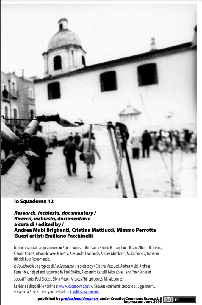 “Lo Squaderno” Rivista di discussione culturale, n. 12, giugno 2009, pp. 59-61 (monografia su “Ricerca, inchiesta, documentario” a cura di Andrea Mubi Brighenti, Cristina Mattiucci, Domenico Perrotta). Puoi consultare l’intera monografia qui.