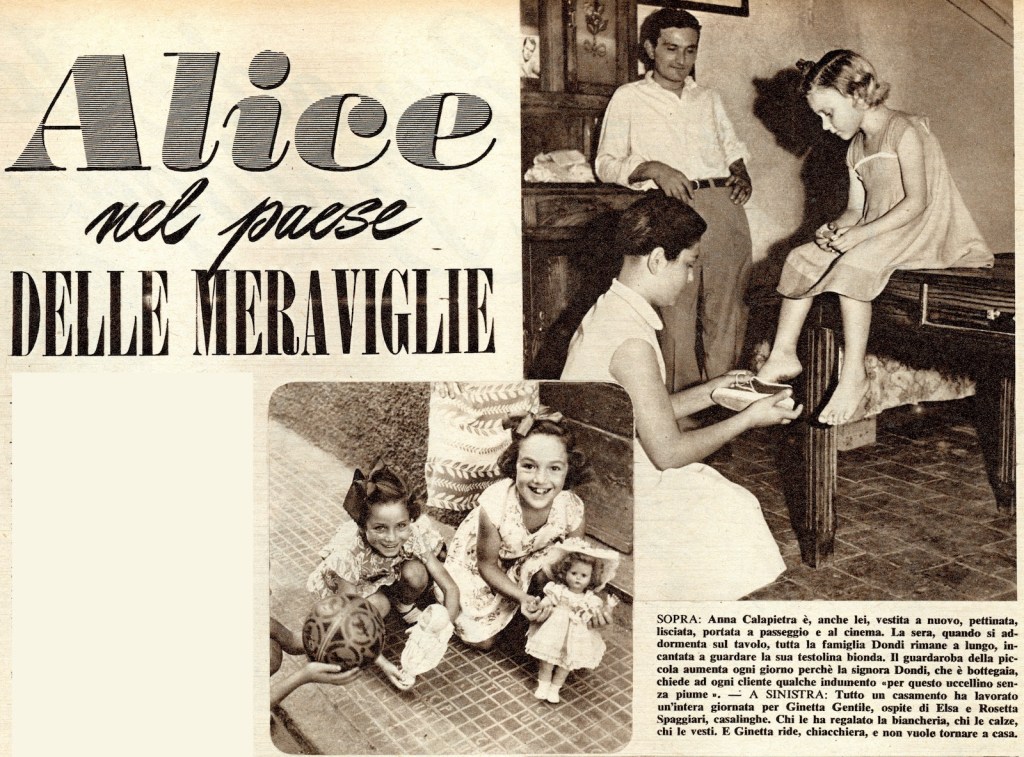 Ho trovato Anna Colapietra sdraiata su di un divano, addormentata fra le braccia di Dondi, un’altra bambina, la figlia di Osvaldo Dondi, il bottegaio che l’ha ospitata. Anna gira sul mondo nuovo che va piano piano scoprendo, due esterefatti occhi azzurri, umidi di felicità: gli occhi di Alice nel Paese delle Meraviglie. È troppo timida per parlare. Invece Ginetta Gentile è la più disinvolta. Me l’hanno indicata, da lontano, a dito, mentre dalle case intorno usciva la gente sulle porte e dalle finestre altre donne facevano capolino. Davanti alla soglia della sua nuova casa Ginetta giocava insieme a due altre bambine, con certe bambolone grandi, bionde, simili a lei.