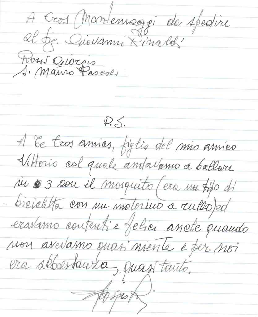Incontrai Giorgio Rossi nel marzo del 2022 a Cesenatico. Presentavo C’ero anch’io su quel treno in un affollato incontro organizzato dalle compagne dell’UDI (Unione Donne in Italia), presso il Museo della Marineria. Intervenne anche lui, come altri, raccontando l’amicizia con Vittorio Montemaggi, il cui padre Giovanni aveva ospitato Vincenzo, un bambino napoletano nel 1947 (qui la storia). Poi al termine della serata gli chiesi se avesse voglia di raccontare qualcosa della sua famiglia e mi promise che avrebbe provato a scrivere alcune delle tante cose che la sua memoria conservava e che avrebbe avuto piacere a raccontare.
